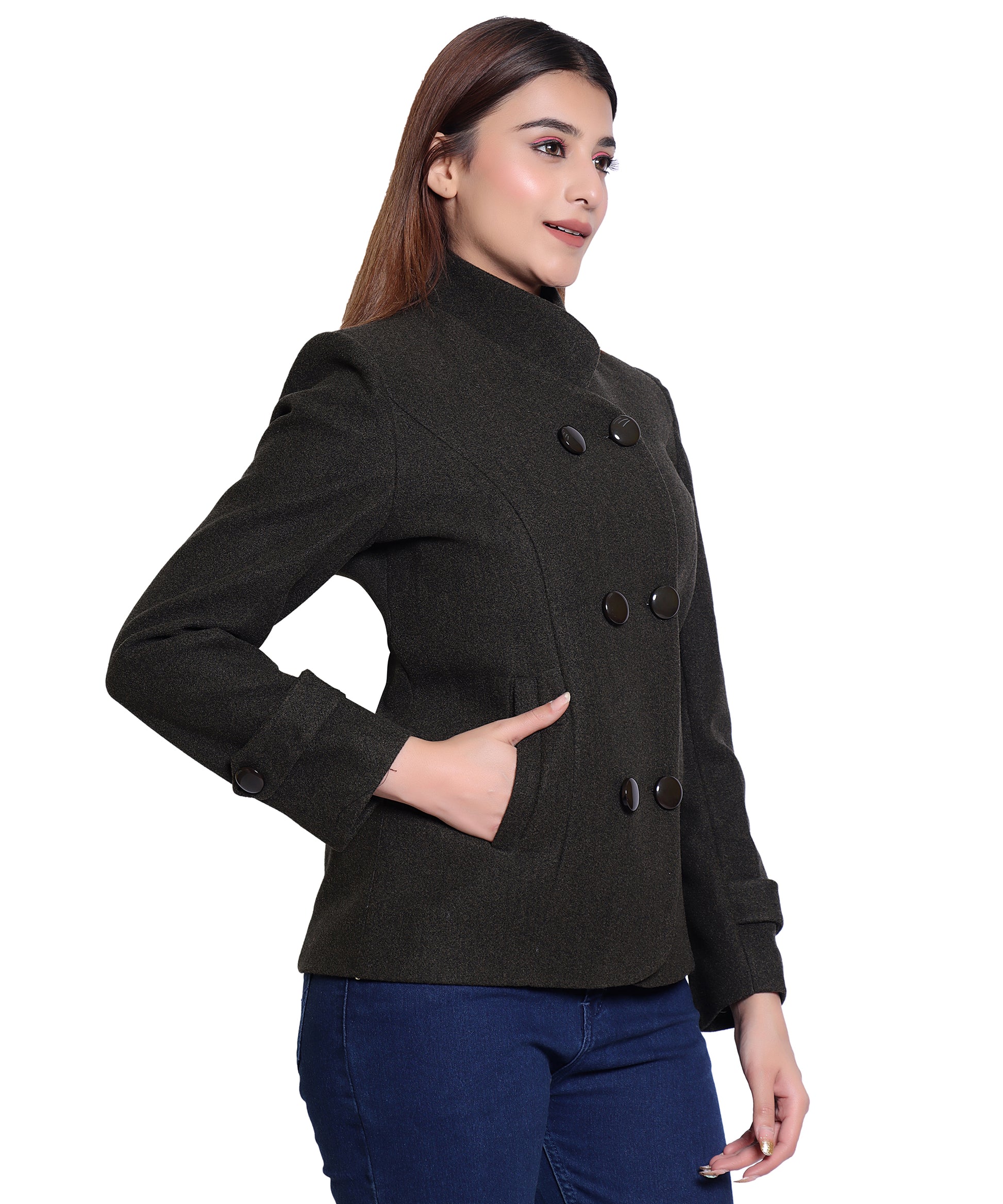 Upgrade your winter style with this elegant double breasted wool blend coat from Comfy Sparrow. It features a structured stand collar that adds a modern, sophisticated touch. The dual button closure enhances warmth while giving the coat its classic, polished look. Crafted from a cozy wool blend fabric, it offers excellent comfort for chilly days. The tailored silhouette, functional side pockets, and premium finishing make it perfect for daily wear, office outfits, and winter outings.